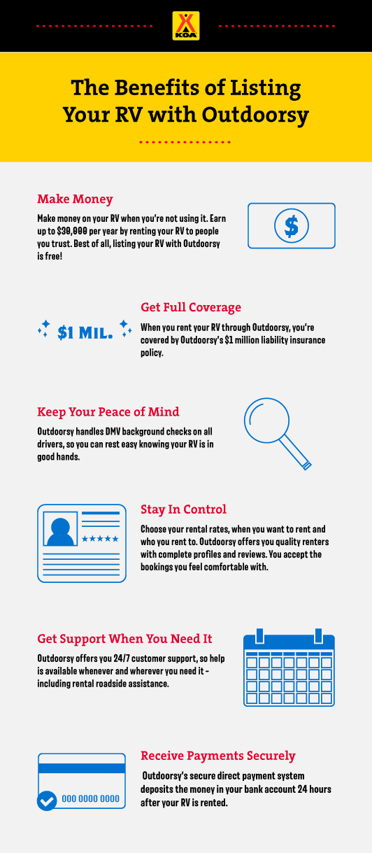 Outdoorsy's $1 million liability insurance policy covers your RV when it is being rented. This policy also covers you for theft and damage subject to Outdoorsy's policies.